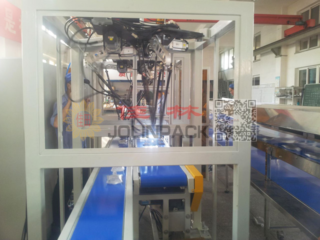 軟袋后包裝線主要工藝流程:自動(dòng)開箱→合格證、說明書投入→隔板投放→整齊下袋→接袋→燈檢→理袋機(jī)器人理袋→包裝機(jī)→裝箱→稱重剔除機(jī)→折蓋封箱機(jī)→轉(zhuǎn)向輸送機(jī)→噴碼及監(jiān)管碼賦碼→監(jiān)管碼復(fù)核→剔除機(jī)→轉(zhuǎn)向輸送機(jī)→提升機(jī)→自動(dòng)輸送到相鄰倉庫